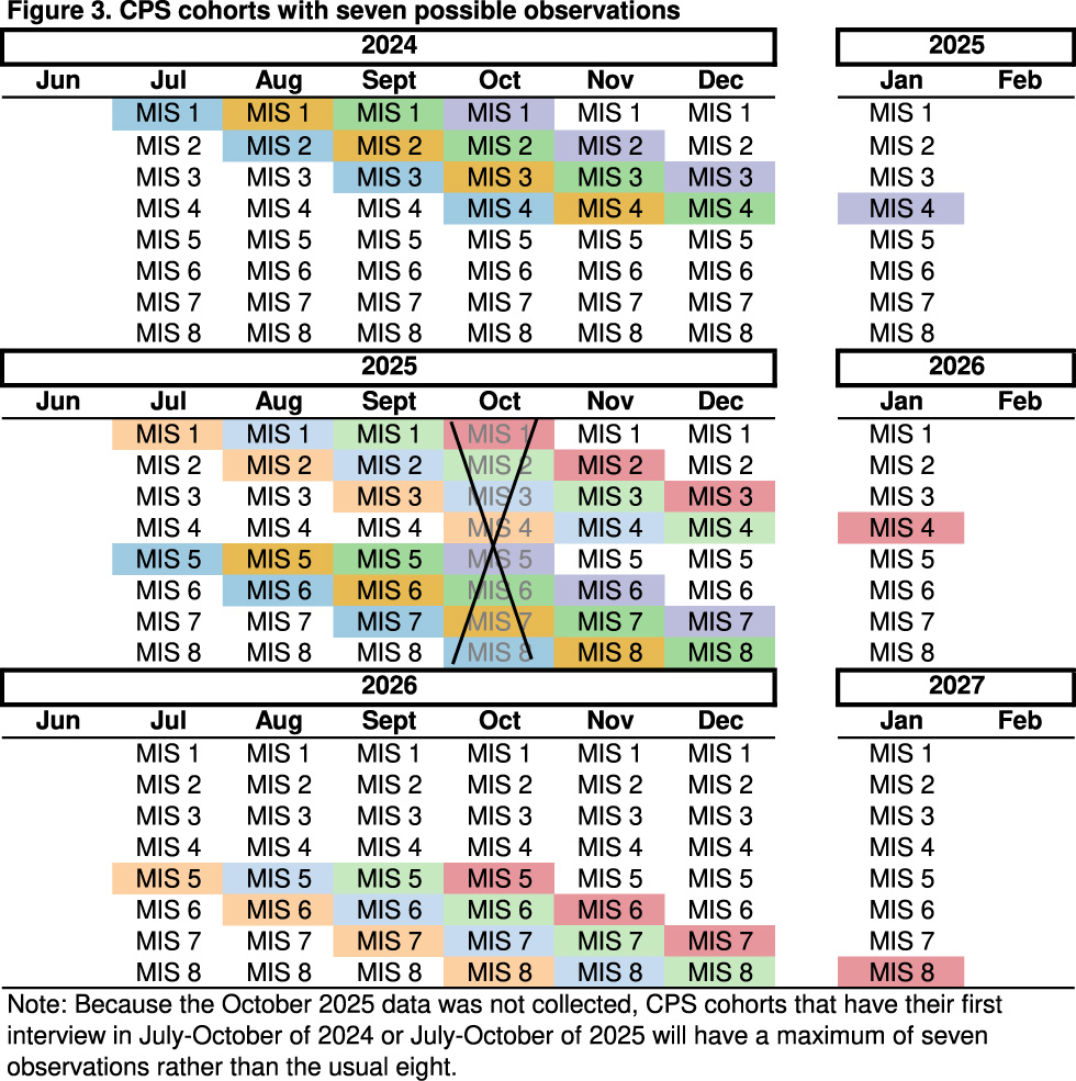 - Full panel linkages: The eight CPS cohorts that were eligible to be interviewed in October 2025 will have a maximum of seven observations in the data. Households that enter the CPS in July, August, September, or October in 2024 or 2025 will only be observable seven times in the CPS data. As shown in Figure 3, the cohort entering the CPS in July 2024 would have had their MIS 8 observations collected in October 2025, but these data are missing. Similarly the cohorts entering in August, September, and October 2024 are missing their MIS 7, 6, and 5 values, respectively, and cohorts that enter the CPS in July-October of 2025 are missing their MIS 1 through 4 observations, respectively. Due to the structure of the CPS rotation pattern, the impacts of a single missing month impact CPS panels spread across four calendar years.