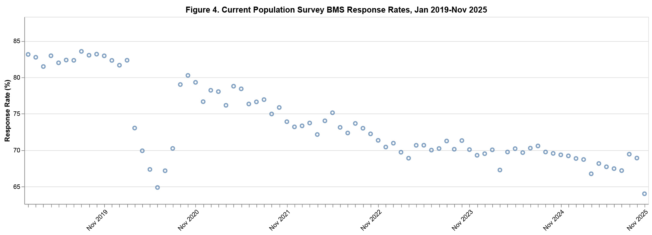 Current Population Survey response rates, as with many after federal surveys, have been declining over time (Czajka & Beyler, 2016; American Statistical Association, 2025). This trend has accelerated since the COVID-19 pandemic however, November 2025 CPS response rates represent a new low (see Figure 4). At 64%, the November 2025 response rate is even lower than the rate for June 2020, which represented the low point of CPS response during the COVID-19 pandemic.
