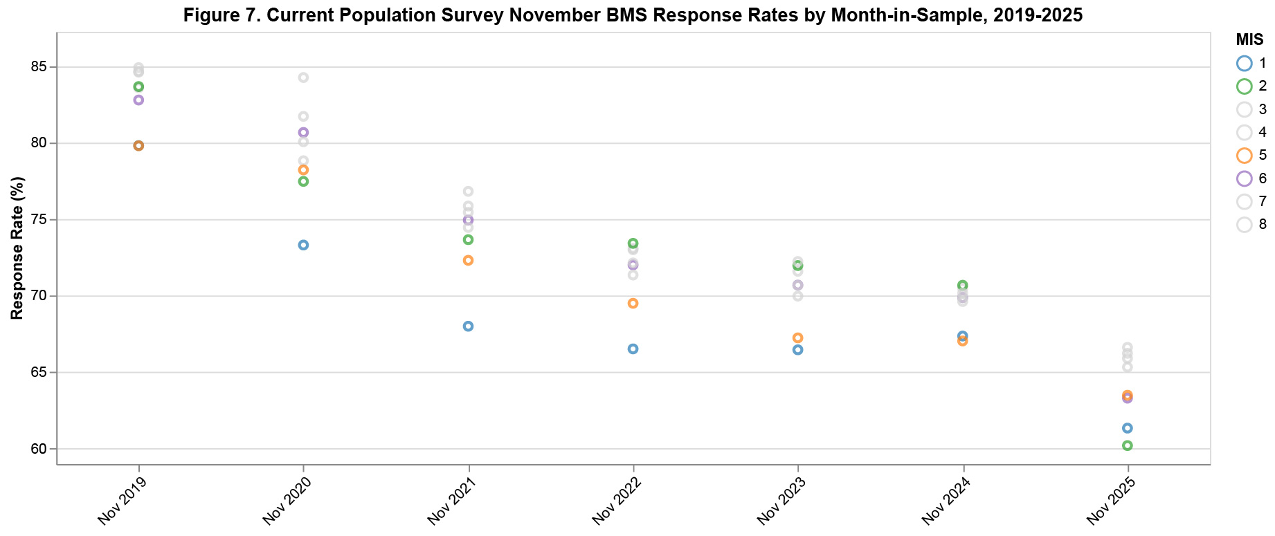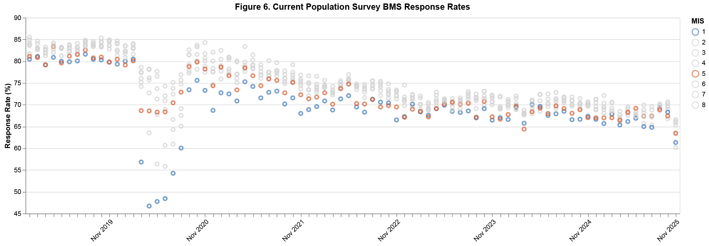 While the cohort entering the CPS in October 2025 will be assigned to MIS 2 in November 2025, the November 2025 data collection represents their first CPS interview. Likewise, the CPS cohort that would have re-entered the survey after the eight-month break in October 2025 will be in MIS 6 in November, but their re-entry now follows an effective nine-month break. The response rates of these late-entering and late-returning CPS cohorts in November of 2025 have low response rates similar to those entering and re-entering cohorts in other months. As seen in Figure 7, response rates among MIS groups 2 and 6 are much more similar to those of MIS 1 and MIS 5 groups in November 2025 than in this month in previous years when data collection was not interrupted.