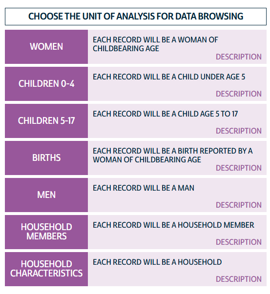 For example, to investigate how child characteristics are related to characteristics of their mother, users will need to download and link data between the Children (either 0-4 or 5-17) unit of analysis and the Women unit of analysis.